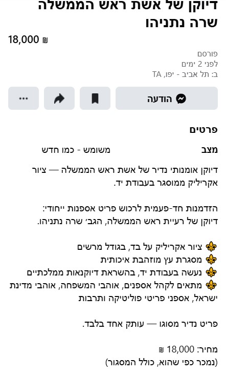 ירדן אדר העלתה ל-Marketplace בפייסבוק פריט חריג למכירה - דיוקן של אשת ראש הממשלה. בשיחה עם mako סיפרה כי מדובר ביצירה אישית שלה, וכי קיבלה המון הצעות, כולל כאלו בסכומים גבוהים מזה שביקשה: "חצי מהסכום ייתרם למשפחות שנפגעו ב-7 באוקטובר"