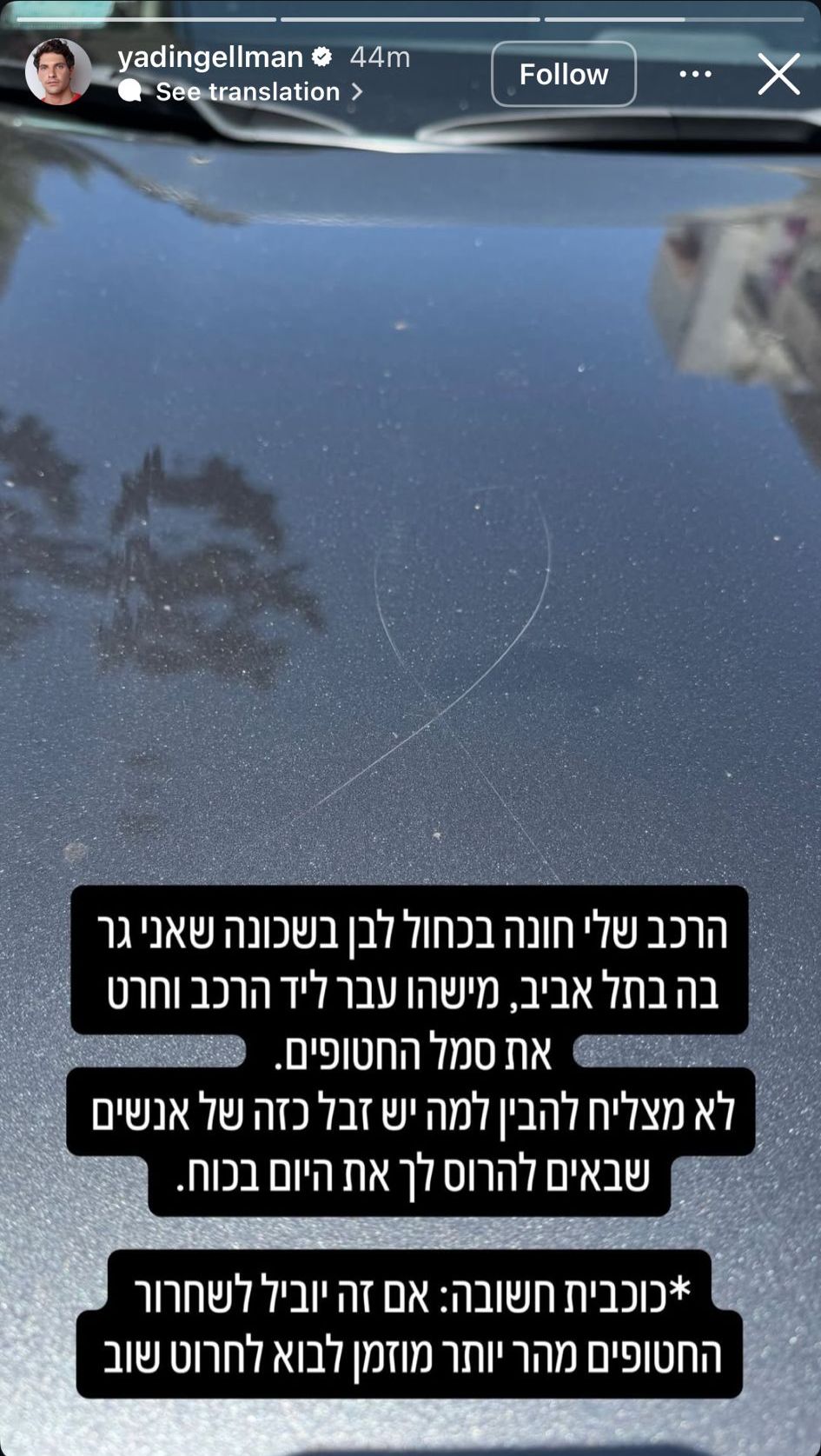 ידין גלמן פתח את השבוע בצורה פחות נעימה, כשגילה שמישהו החליט להשחית את הרכב הפרטי שלו - ולחרוט עליו באופן מפתיע דווקא את סמל החטופים. גלמן העלה לאינסטגרם שלו צילום מסך של הנזק, ולא הסתיר את הכעס שלו על מעשה הוונדליזם.