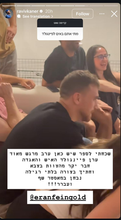 האמן העלה תמונה ממפגש החברים בו נכח גם חברו מהתוכנית האחרת, פיינגולד, והוסיף לכתוב: "שכחתי לספר שיש כאן ערב מרגש מאוד, ערן פיינגולד האיש והאגדה, חבר יקר מהצוות בצבא וחתיך בצורה בלתי רגילה נבחן במאסטר שף ועבר!".