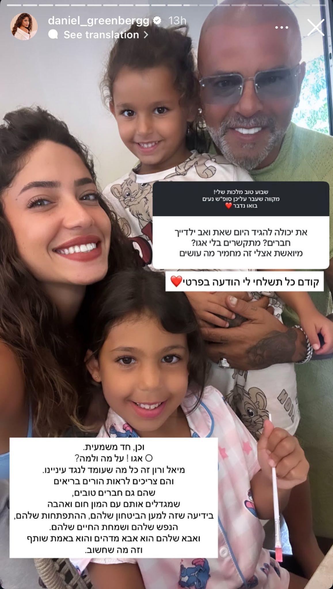 גרינברג הוסיפה וכתבה: "הם צריכים לראות הורים בריאים שהם גם חברים טובים, שמגדלים אותם עם המון חום ואהבה בידיעה שזה למען הביטחון שלהם, ההתפתחות שלהם, הנפש שלה ושמחת החיים שלהם. אבא שלהם הוא אדם מדהים והוא באמת שותף, וזה מה שחשוב".