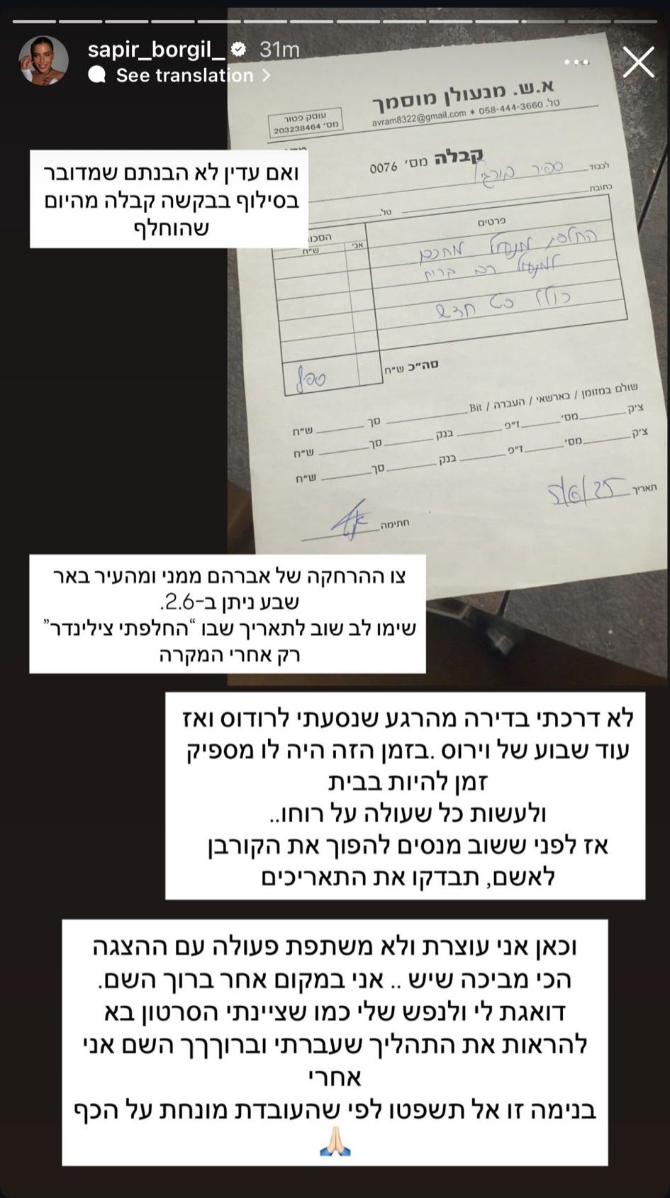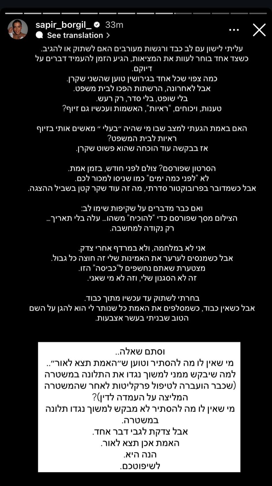 עוד כתבה בורגיל: "כשצד אחד בוחר לעוות את המציאות, זה הזמן להעמיד דברים על דיוקם. כמה צפוי שכל אחד בגירושים טוען שהשני שקרן, אבל לאחרונה, הרשתות הפכו לבית המשפט. בלי שופט, בלי סדר, רק רעש. האם באמת הגעתי למעמד שבו מי שהיה 'בעלי' מאשים אותי בזיוף ראיות לבית המשפט? אז בבקשה, עוד הוכחה שהוא פשוט שקרן".