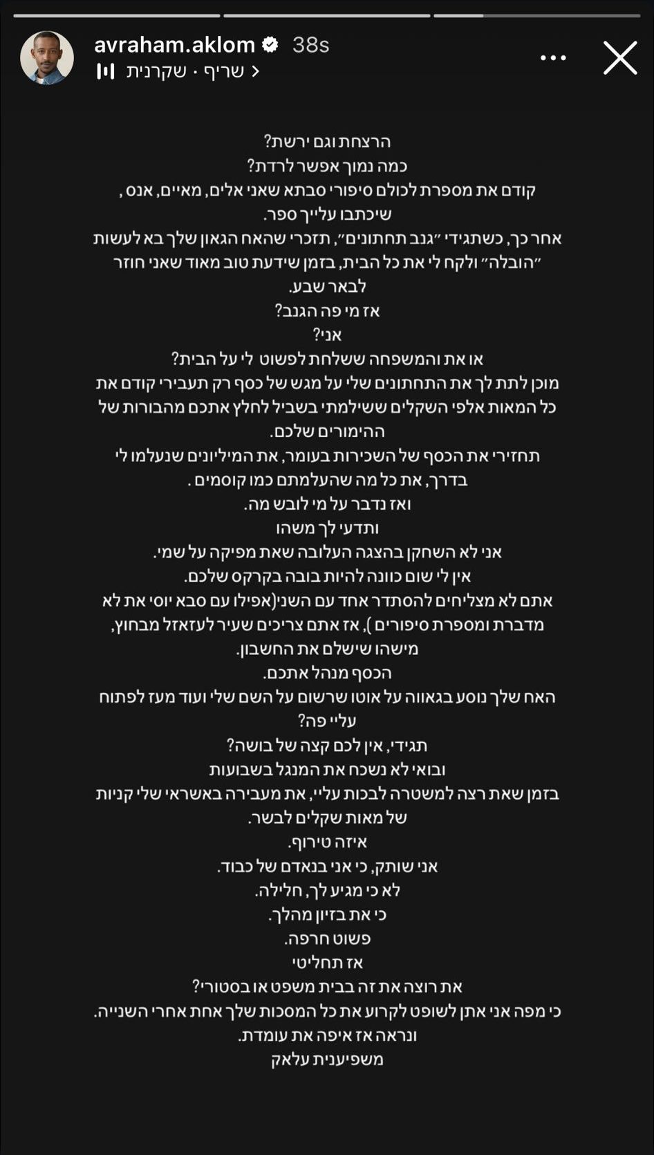 אקלום ראה את רצף הסטוריז של בורגיל, שבהם היא מנסה להוכיח את צדקתה, ומיהר להגיב בחזרה בטקסט חריף: "הרצחת וגם ירשת? כמה אפשר לרדת? קודם את מספרת לכולם סיפורי סבתא שאני אלים, מאיים, אנס. אחר כך, כשתגידי 'גנב תחתונים', תיזכרי שהאח הגאון שלך בא לעשות 'הובלה' ולקח לי את כל הבית, בזמן שידעתי טוב מאוד שאני חוזר לבאר שבע. אז מי פה הגנב? אני? או את והמשפחה ששלחת לפשוט לי על הבית?".