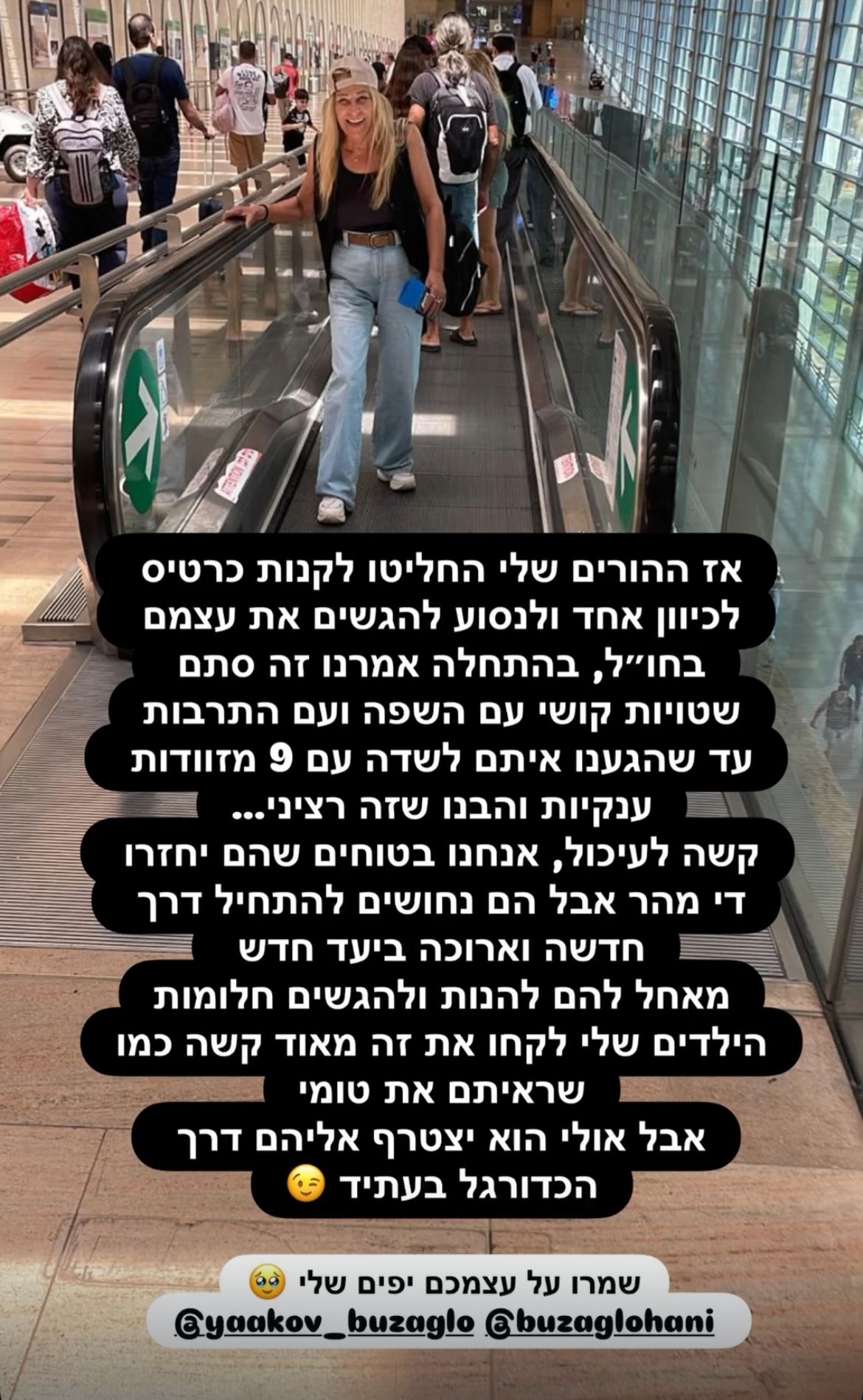 "ההורים שלי החליטו לקנות כרטיס לכיוון אחד ולנסוע להגשים את עצמם בחו"ל", כתב בנם הצעיר אלמוג בוזגלו בסטורי שהעלה לאינסטגרם, והוסיף, "בהתחלה אמרנו שזה סתם שטויות, קושי עם השפה ועם התרבות, עד שהגענו איתם לשדה עם תשע מזוודות ענקיות והבנו שזה רציני".