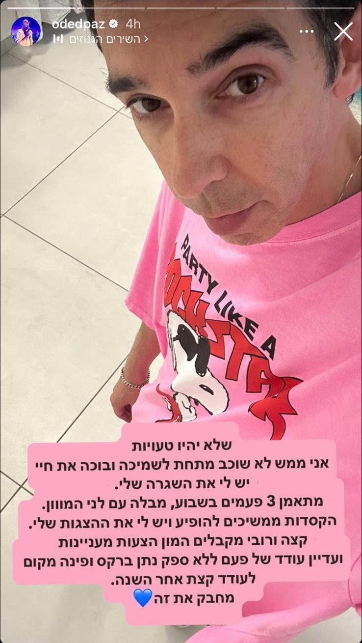 אחרי שנה שבה עבר טלטלות בחייו האישיים, עודד פז משתף על התקופה המורכבת איתה הוא מתמודד - ולא מסתיר את הקשיים. "לא יודע אם זה דיכאון או סתם דאון רגעי. עודד של פעם ללא ספק נתן ברקס", כתב בסטורי שהעלה לאינסטגרם