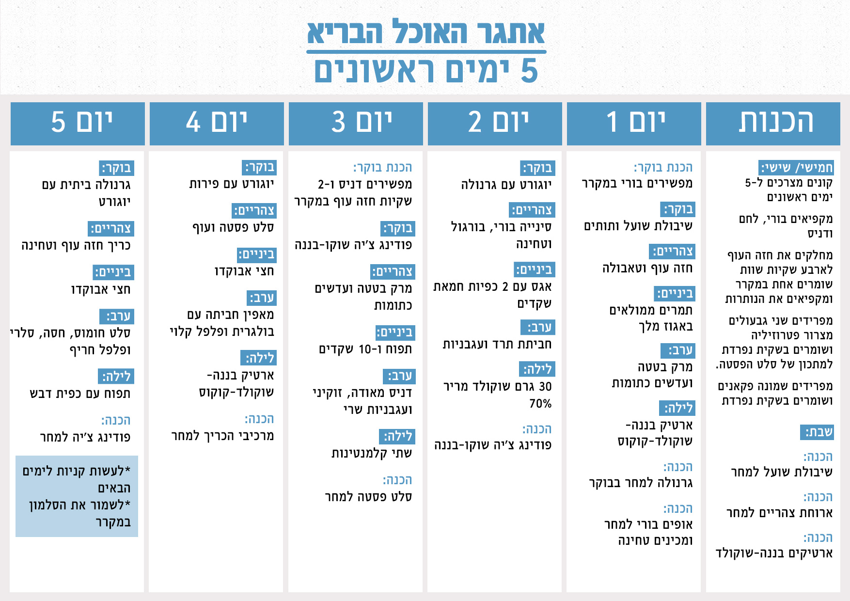 1. לא מדובר באתגר של דיאטה אלא של אכילה בריאה. לכן אתם מוזמנים להתאים את המנות לגודל שמתאים לכם. למשל: לא מאמינים שתוכלו לשבוע מ-100 גרם חזה עוף? אל תתביישו להכפיל את הכמות. שני תמרים לא מדגדגים לכם את הבטן? תאכלו שלושה. אין לנו כל עניין שתישארו רעבים, יש לנו עניין שתאכלו בריא.