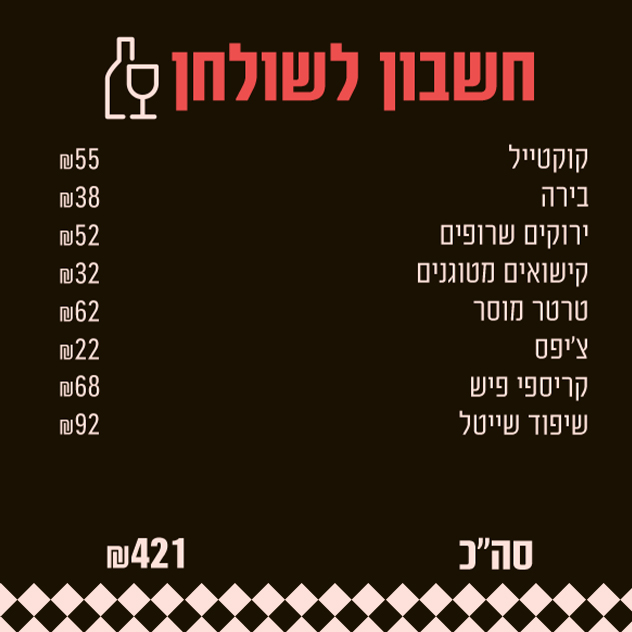 מה שכן הרשים היה הצ'יפס (22 שקלים). צלחת עם צ'יפס זהובים, פריכים, על קליפתם, מוגשים ליד איולי חרדל ולימון אסרטיבי ומוצלח. הזוג שישב בסמוך אלינו בבר שאל את הברמן אם חזרו כאן לזן תפוחי האדמה המקורי, שמתברר שהוא מיטיב עם הצ'יפס הזה פלאים. הברמן גרס שכן. אני לא יודעת איך הוא היה לפני, אבל בביקור שלנו הצ'יפס יישר קו עם הציפיות, וגם עם ההצהרות בתפריט על כך שנתנו לו הרבה אהבה. אבל מעבר לאהבה, נתנו פה גם זמן, תשומת לב והקפדה. הזמנו את צלחת הצ'יפס הקטנה, והיא הייתה הרבה מעבר למספקת בגודלה, ובעיקר סתמה את הגולל על כל יתר המנות שהגיעו אחריה. זה צ'יפס שמטוגן למופת, מתובל היטב, וממכר כראוי. צלחת שהיא אמנם רק תוספת צד, אבל לא כדאי לפספס (מה שכן, על זן תפוחי האדמה הנבחר באותו היום אני לא לוקחת אחריות).