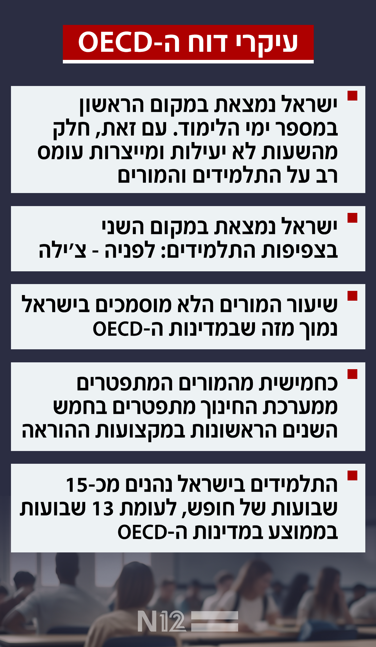 מדי שנה סוקר ארגון ה-OECD בעזרת הדוח Education at a Glance את מצב מערכות החינוך במדינות החברות בו, בהן ישראל • הבוקר פורסם הדוח לשנת 2025, שחשף נתונים מטרידים: רק צ'ילה מקדימה את ישראל מבחינת צפיפות תלמידים, אך מבחינת מספר שעות הלימוד - מערכת החינוך בארץ נמצאת במקום הראשון והשלילי • כמו כן, כחמישית מהמורים בארץ מתפטרים בחמש השנים הראשונות במקצוע • כל הנתונים