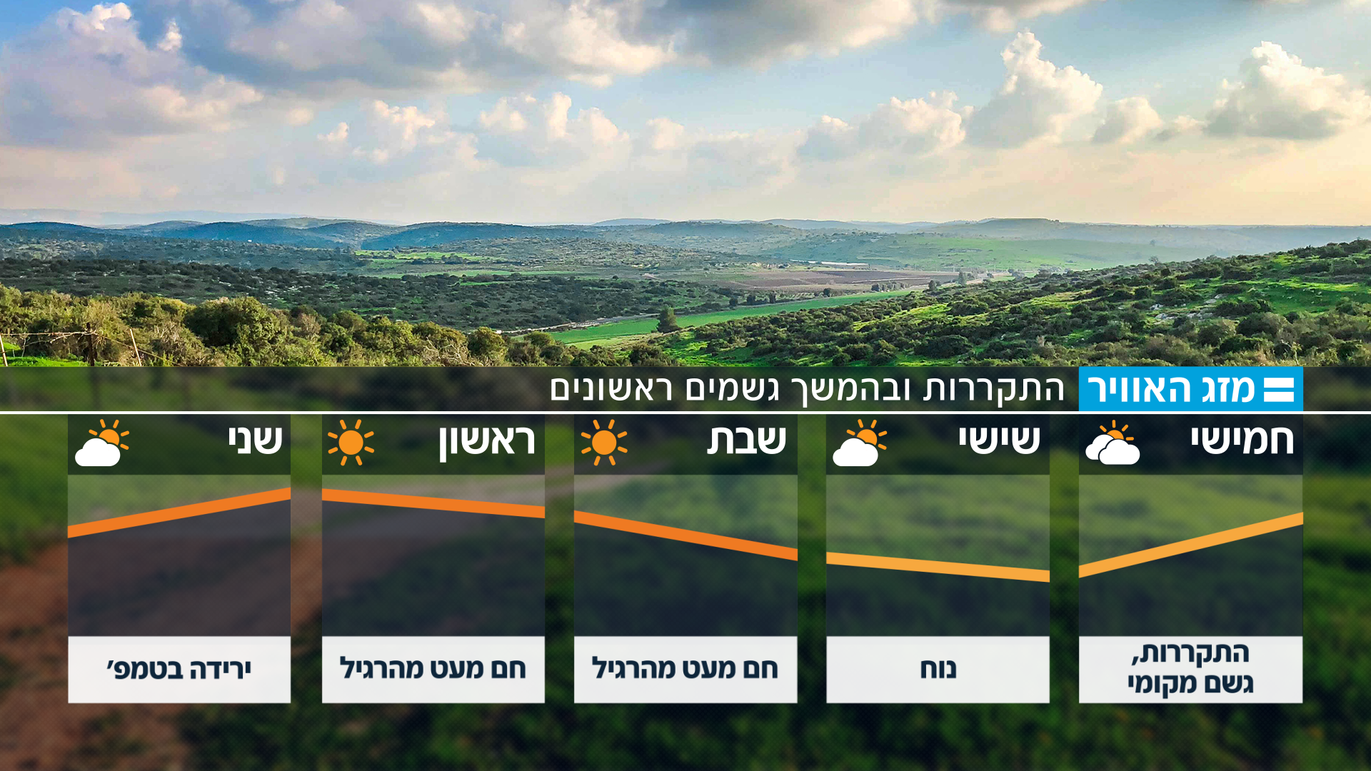 למרות התיעודים הרבים, מדובר בגשמים נקודתיים - וכבר מחר אנחנו צפויים לחזור למגמת התחממות הדרגתית, שתמשיך עד ליום ראשון. בסוף השבוע מזג האוויר יהיה חם מהרגיל לעונה - עם תנאים נוחים יותר לרחצה בים. בשישי מזג האוויר יהיה נוח ובשבת חם מעט מהרגיל לעונה. גם בתחילת השבוע - מזג אוויר חם מהרגיל לעונה, ובשני - ירידה נוספת בטמפרטורות.