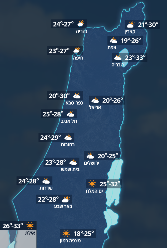 - אזהרה כתומה במישור החוף: ים גבוה ומסוכן לרחצה בים התיכון לאורך היום. מצב הים גלי עד גבה גלים, גובה הגל ינוע מ-80 עד 180 ס"מ - ויישאר במגמת עלייה.