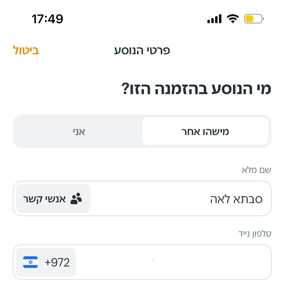 - עכשיו ייפתח לכם חלון - "מי הנוסע בהזמנה הזו?", שבו תתנו את השם המלא ואת הטלפון הנייד של הנוסע, ושמרו.