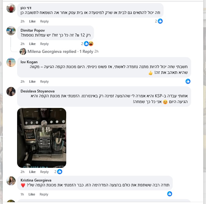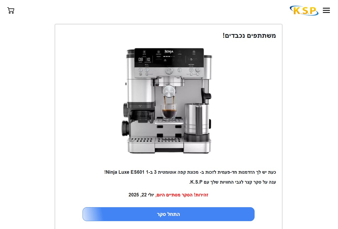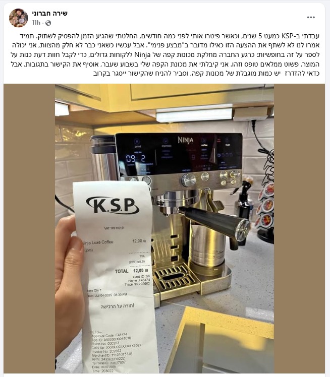 בימים האחרונים מופץ בפייסבוק פוסט של משתמשת שטוענת כי היא עובדת לשעבר ברשת KSP שפוטרה לפני כמה חודשים. בפוסט היא חושפת, לכאורה, מבצע פנימי של שמיועד לעובדים בלבד, שבמסגרתו הרשת מחלקת מכונות קפה של חברת Ninja ב-12 שקלים בלבד למי שימלא טופס קצר. כמות מכונות הקפה מוגבלת, מסבירה כותבת הפוסט, וממליצה לקוראים להזדרז.