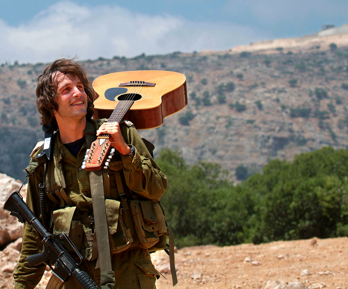 חייל מילואים חוזר מלבנון עם גיטרה על כתפו ורובה משולב על חזהו. אזולאי: "בגיטרה שהיא סוג של כלי נשק בלי כדורים אבל עם יכולת להנפיק מוסיקה נפלאה - לצד הרובה שיש לו צלילים אחרים. הניגודיות הזו מופלאה בעיניי".