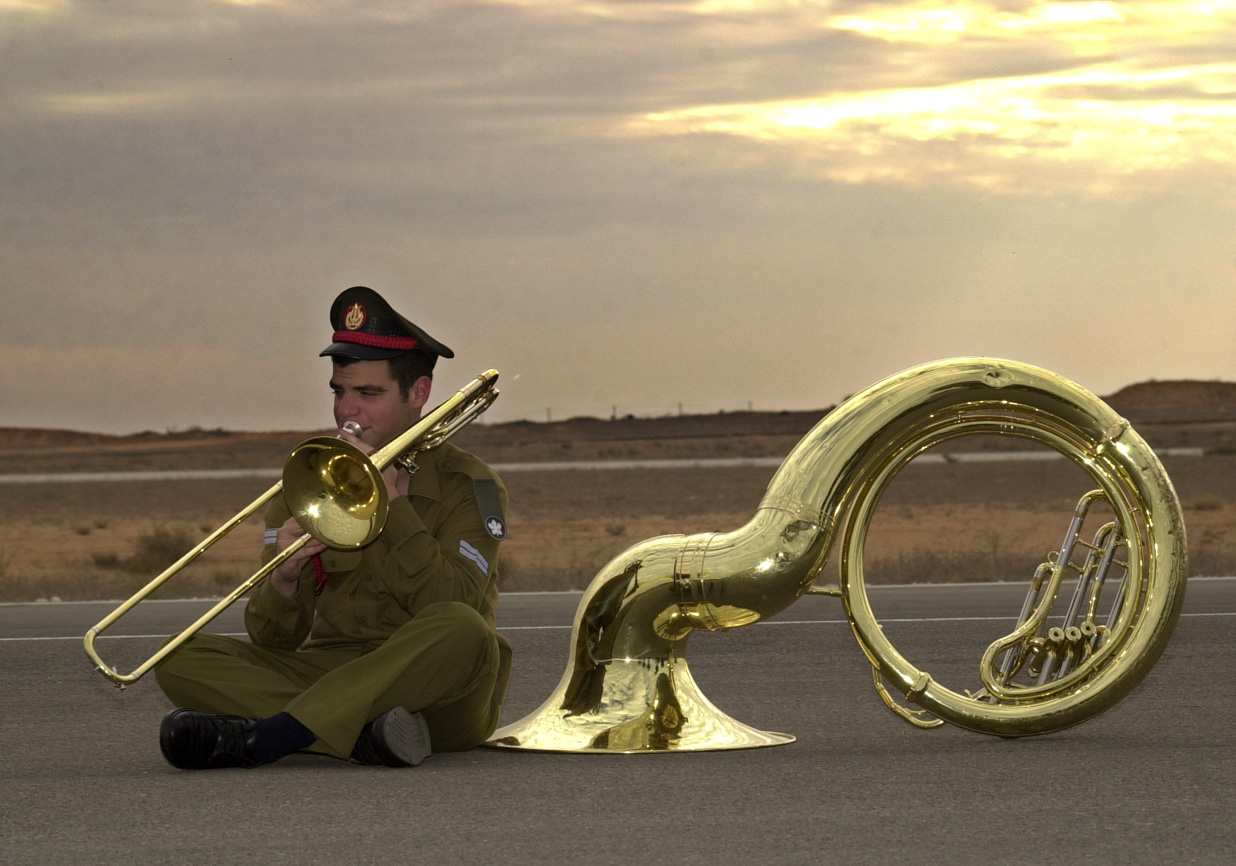נגן טרומבון בתזמורת צה"ל מתכונן להופעה בקורס טיס, ועורך הכנות אחרונות לקראת ההופעה בפני הטייסים החדשים ובני משפחותיהם. אזולאי: "זו אחת התמונות הכי מדהימות שתפסתי באופן הכי ספונטני".
