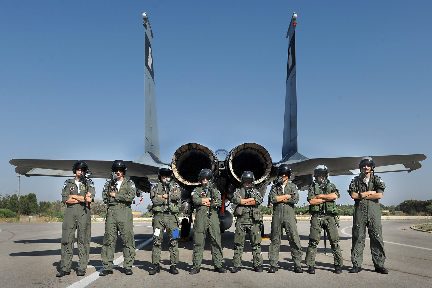 שמונה טייסי קרב של מטוסי F15 בתל נוף, תופסים פוזה בין אימון אחד לשני.